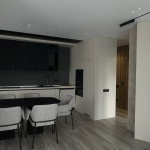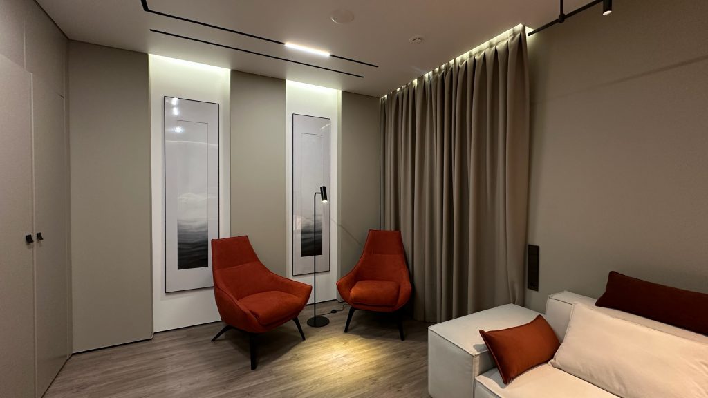 Комплектация (профиль работ): Установлены натяжные потолки, освещение от ЦентрСвет, тихие стены, розетки и выключатели фирмы Jung, интегрирована система умного дома.