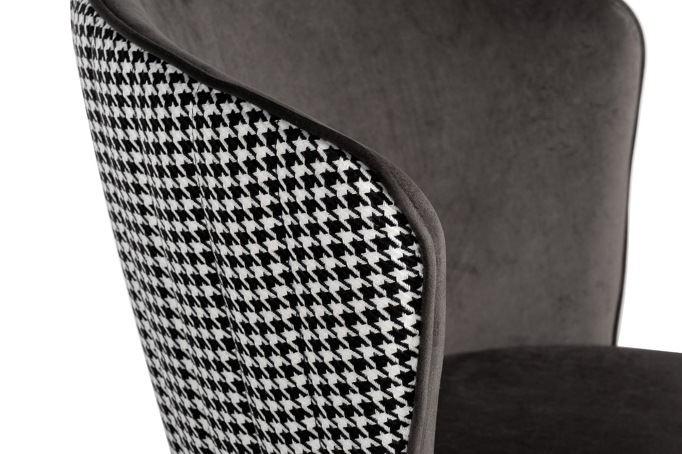 Оригинальный стул выполнен в комбинации приятного серо-коричневого велюра на лицевой части и текстиля с орнаментом "гусиная лапка" на тыльной части спинки. Оформление спинки - гладкая внутренняя поверхность и волнистая внешняя форма с вертикальной прострочкой. Габариты сиденья: ширина 47см, глубина 45см, высота от пола - 48см. Цвет изделия может незначительно отличаться от изображений на сайте в зависимости от цветопередачи вашего устройства.