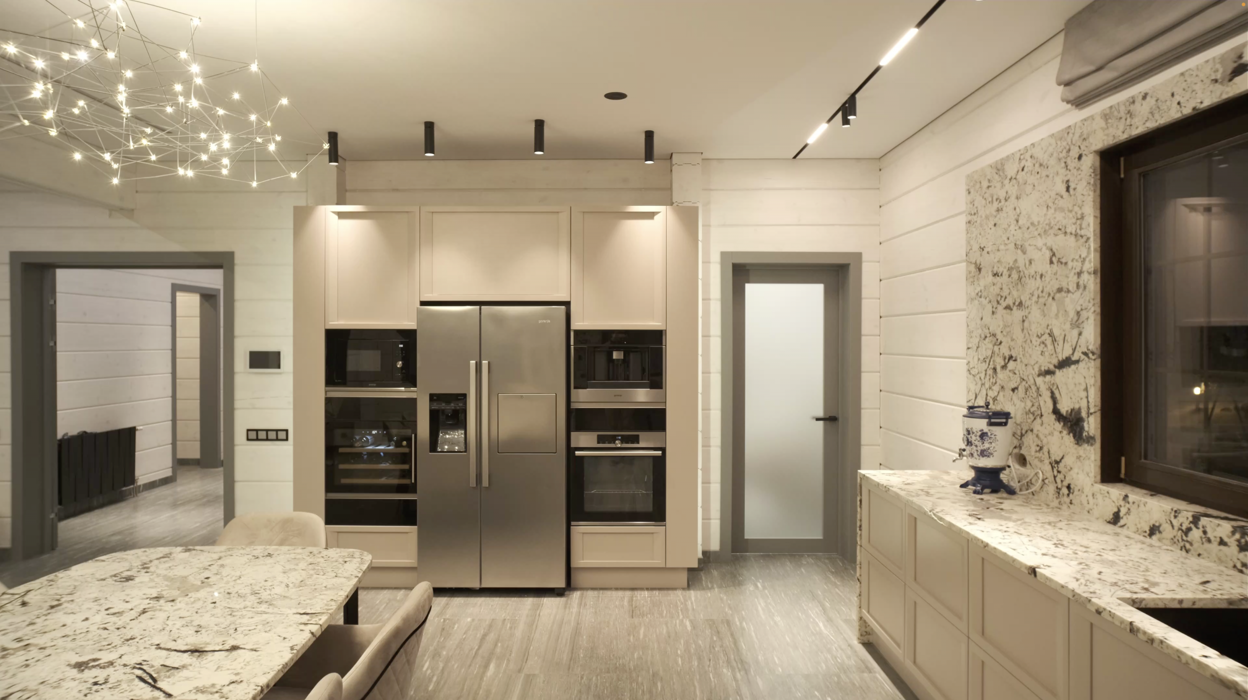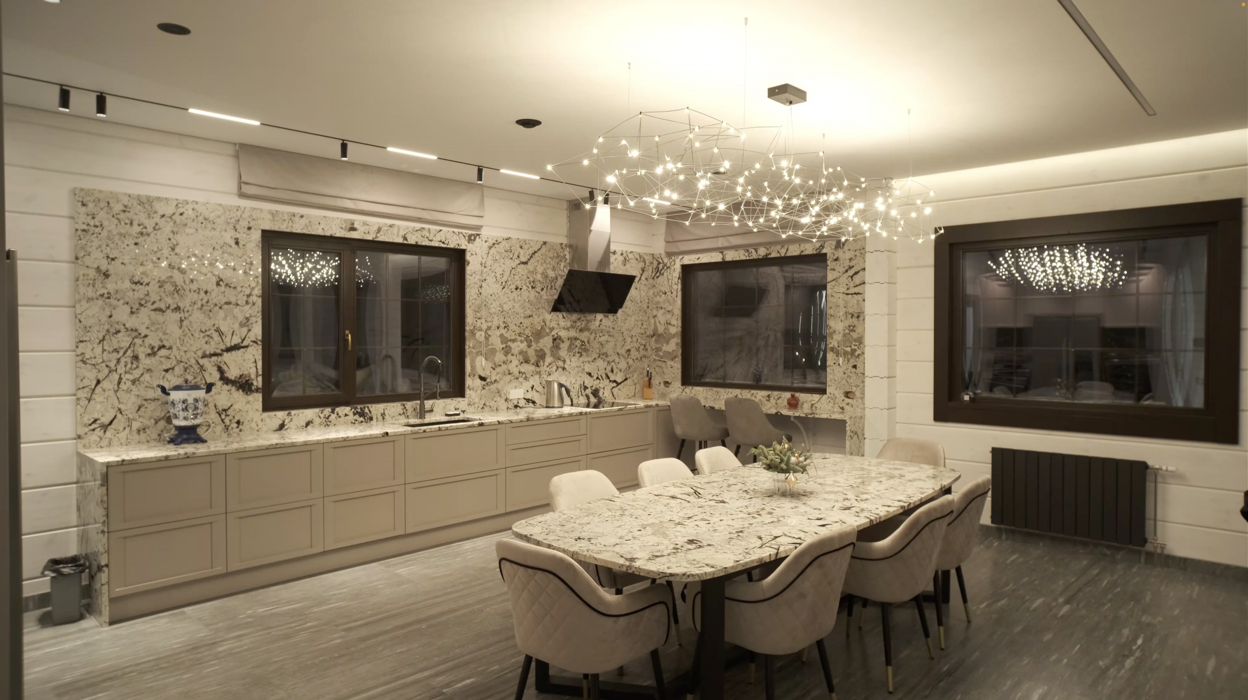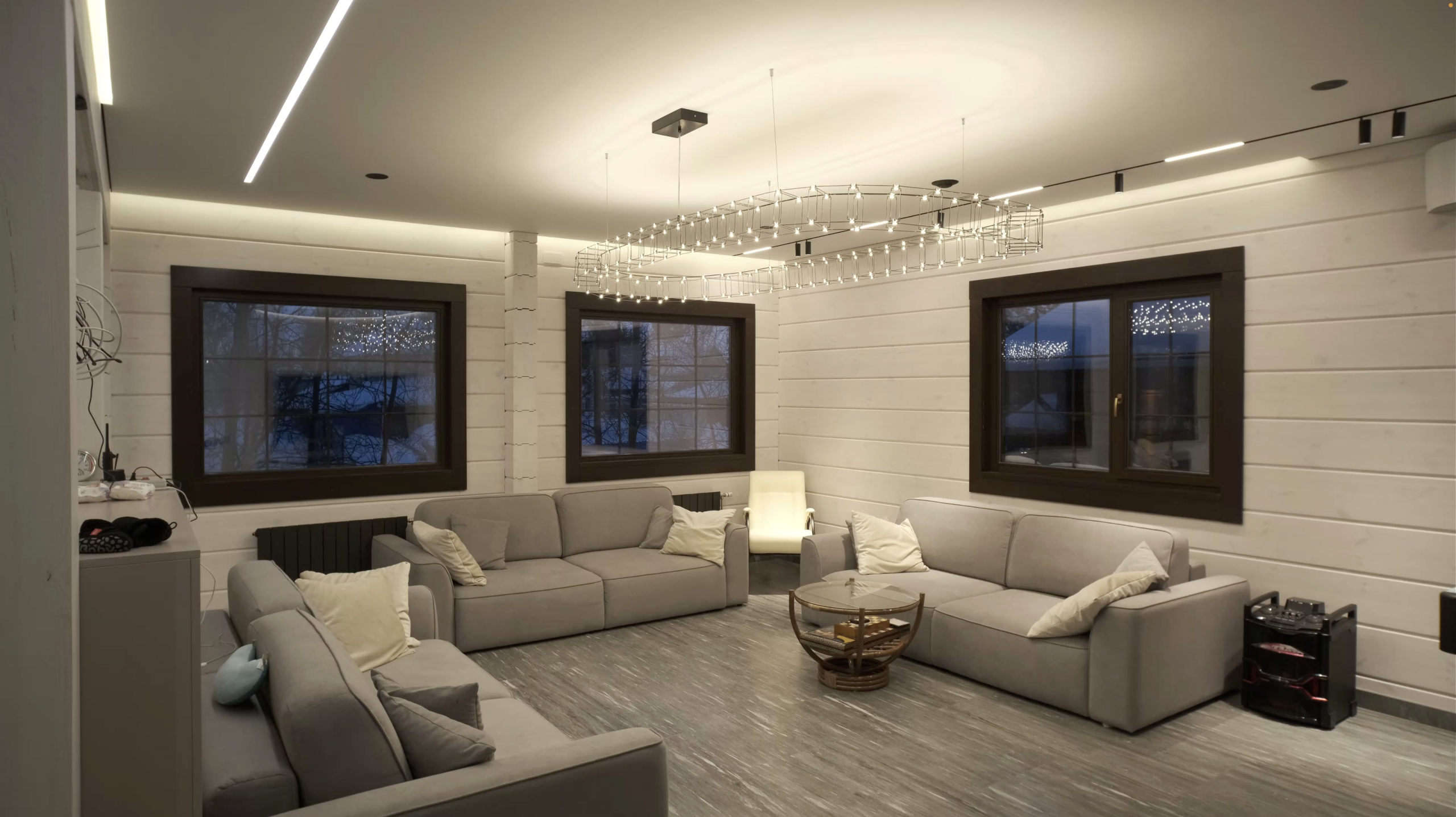 В 2023 г. наши специалисты выполнили комплексную работу по проектированию и светорасчету, монтажу натяжных потолков, а также по интеграции системы освещения в интерьер дома и пусконаладочные работы сети «Умного Дома».